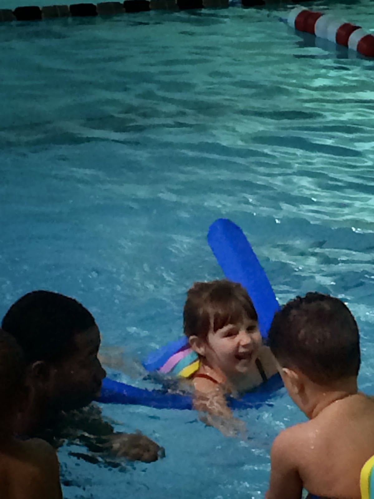 Sophie has been in and out of swimming lessons over the last two years, and she’s finally starting to get the hang of it. This is the first session where’s she’s in the water without a parent with her. She isn’t a huge fan of it, but once she gets going she does okay. Here she is with the noodle.